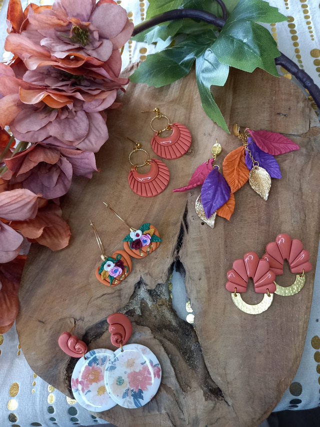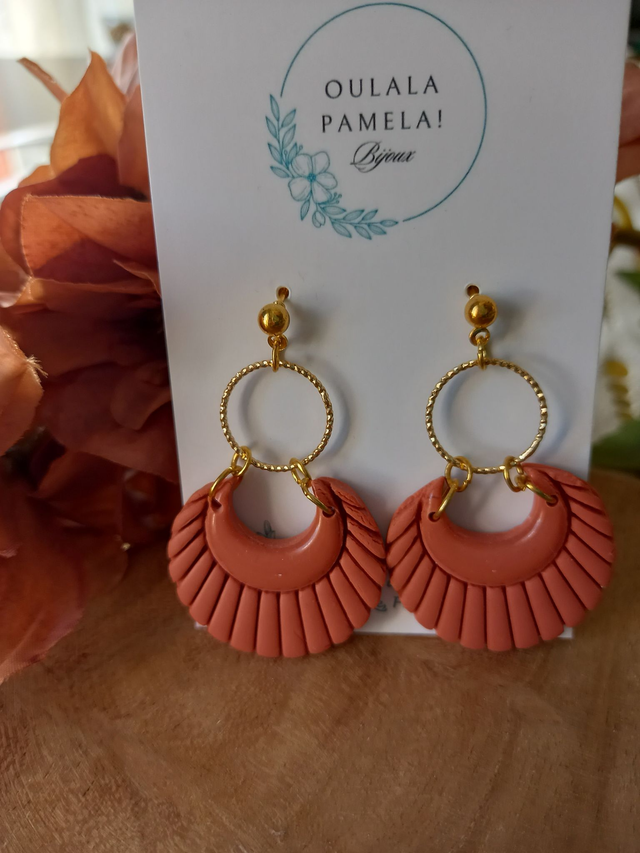 Boucle d’oreilles en argile polymère et résine. Apprêts dorés en acier inoxydable hypoallergénique. Fabriqué à la main en France au cœur de la Corrèze.
