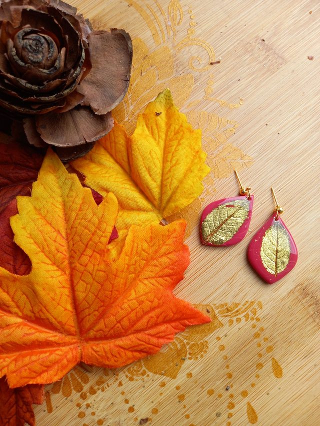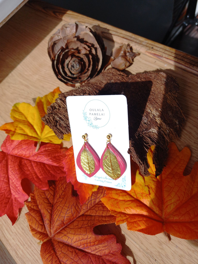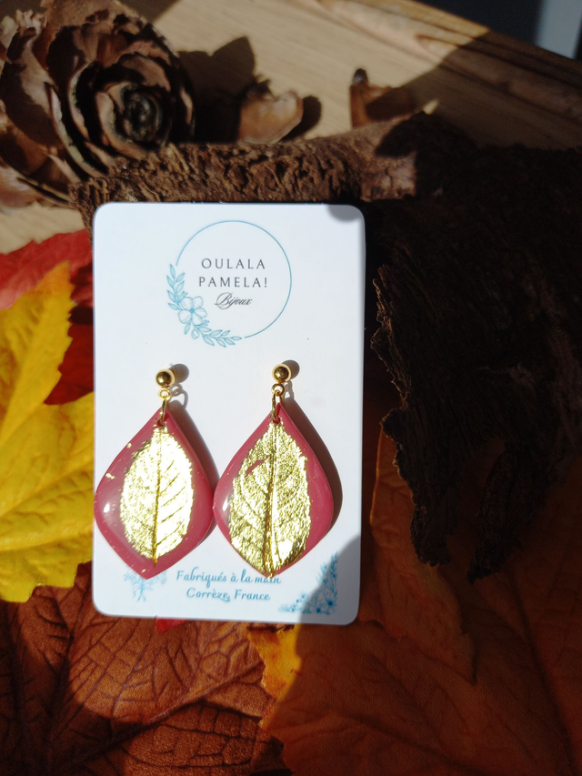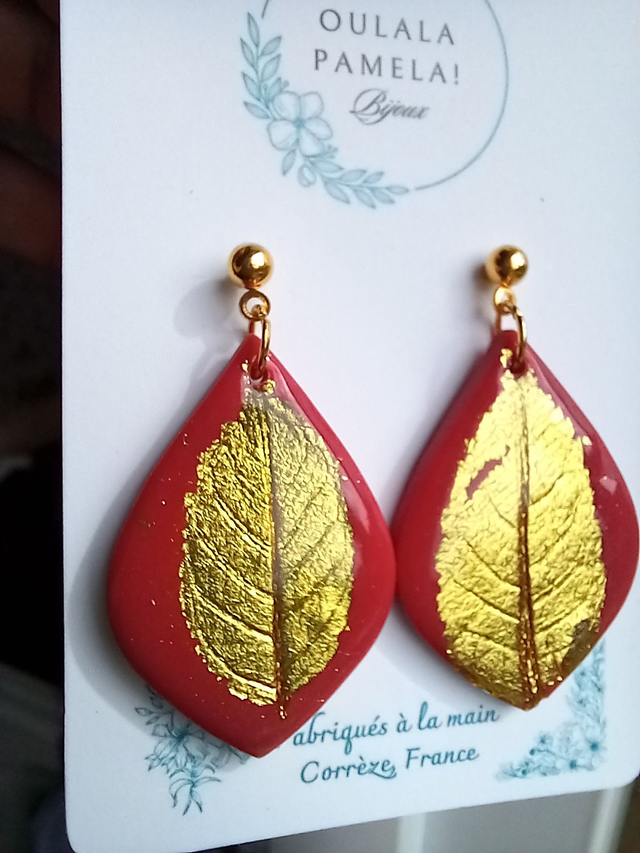 Argile polymère, feuille d'or et résine. Apprêts en acier inoxydable hypoallergénique. Fabriqué à la main en France au cœur de la Corrèze.