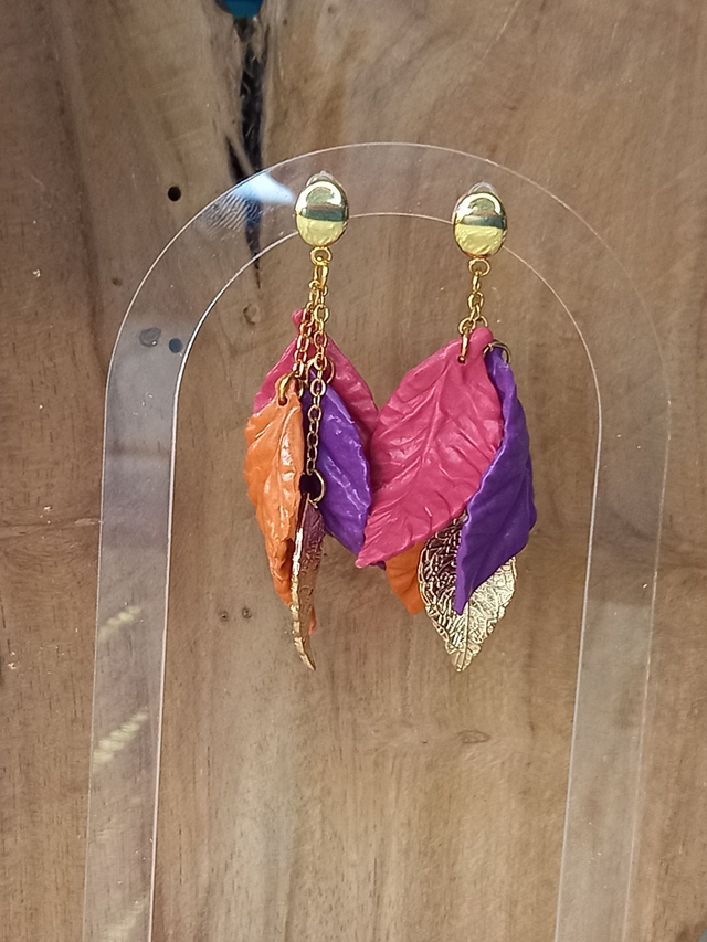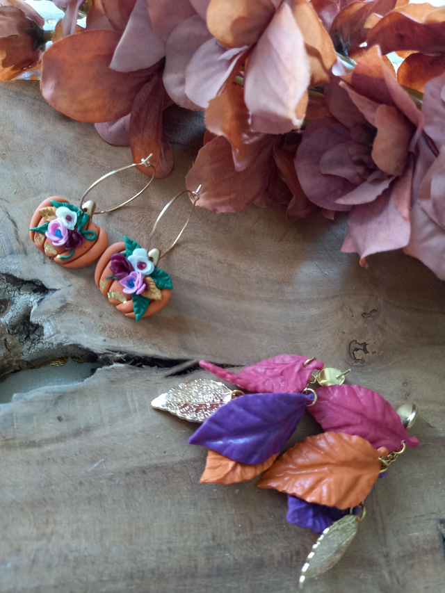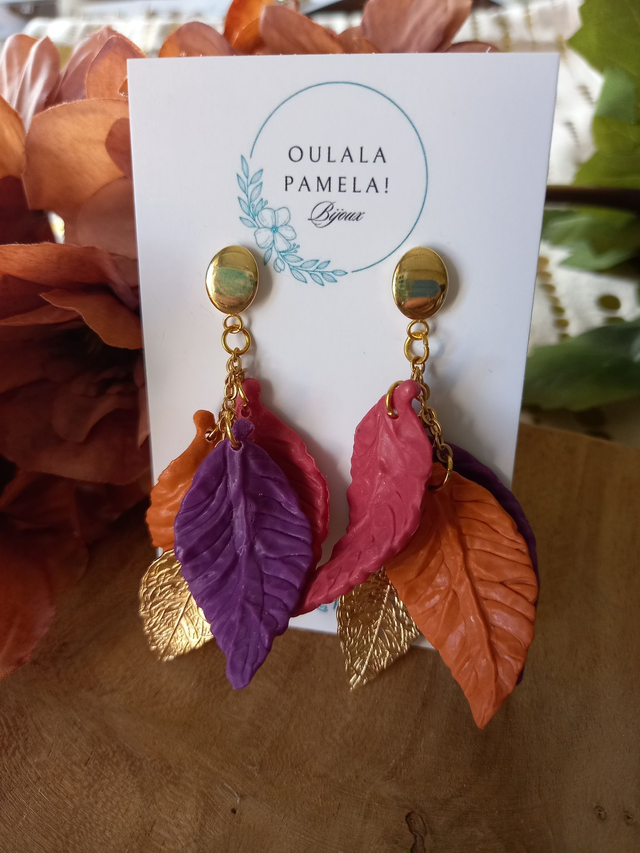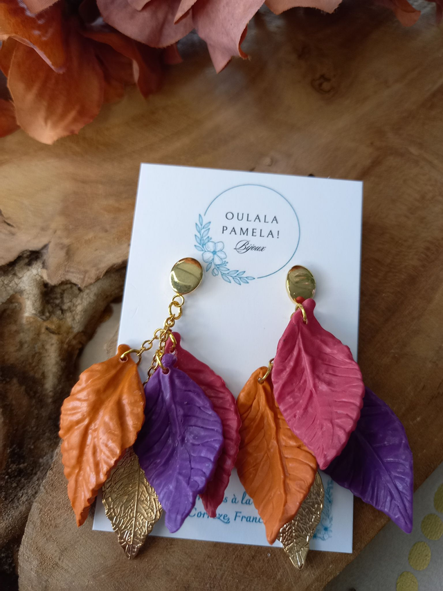 Ces boucles pendantes aux multiples feuilles d’automne et aux touches de doré seront d’abord remarquées et très vite enviées. Oulala mais où vas-tu chercher cette fantaisie là ? Réponse : chez Pamela (ou Karine si tu préfères).
