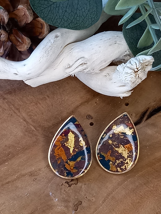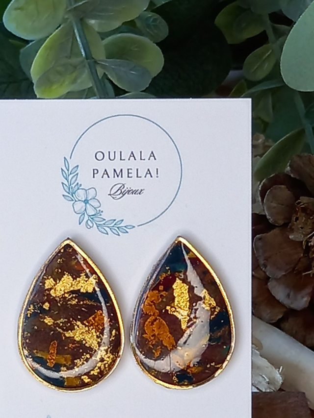 Ces gouttes mêlant feuille d’or et cuivre sont indubitablement LE succès de cet hiver! Qui penserait à de la pâte polymère ? Seules les amatrices de boucles d’oreilles, légères et rafinées : Oulala Pamela.